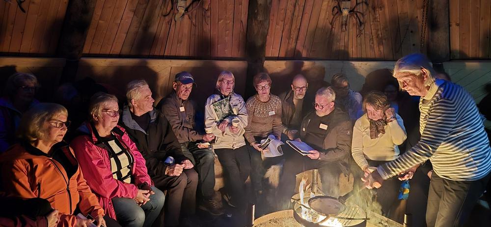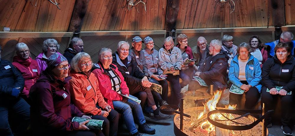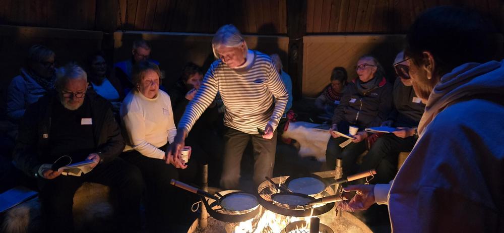 Ensimmäisen päivän iltana Ylläskaltion kodassa lätynpaistossa ja yhteislauluja laulamassa: